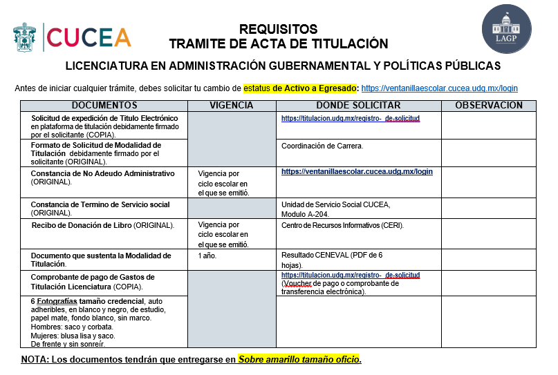 Para poder ser considerado egresado de la Licenciatura en Administración Gubernamental y Políticas Públicas tendrás que haber cubierto todos los créditos contemplados en lo que corresponde a las diferentes áreas de formación que integran el plan de estudios de la misma, una vez que tus créditos faltantes estén en cero, deberás solicitar el cambio de estatus a EGRESADO a través de la pagina https://ventanillaescolar.cucea.udg.mx/login
